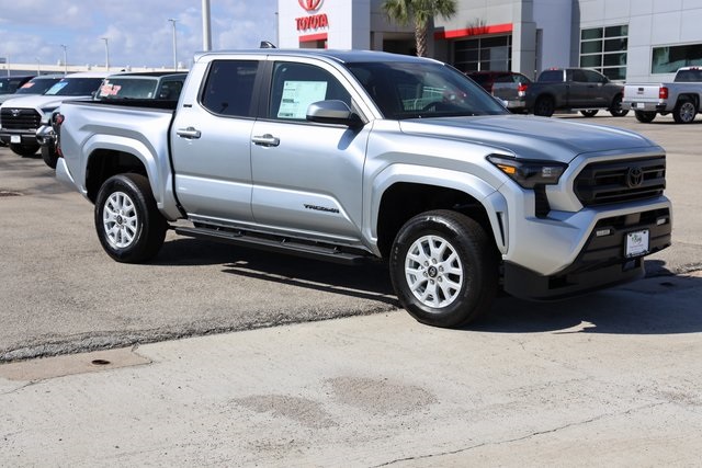 Celestial Silver 2025 Toyota Tacoma SR5 4WD 8-Speed Automatic 2.4L 4-Cylinder 4WD, 9 Speakers, ABS brakes, Alloy wheels, Black Badge Overlay (TMS), Black Oval Tube Step (TMS), Black Tailgate Insert (TMS), Carpeted Floor Mats (TMS), Electronic Stability Control, Heated door mirrors, Illuminated entry, Low tire pressure warning, Radio: 8" Toyota Audio Multimedia, Remote keyless entry, Spray-On Bed Liner (TMS), Traction control, Wheels: 17" Styled Alloy.