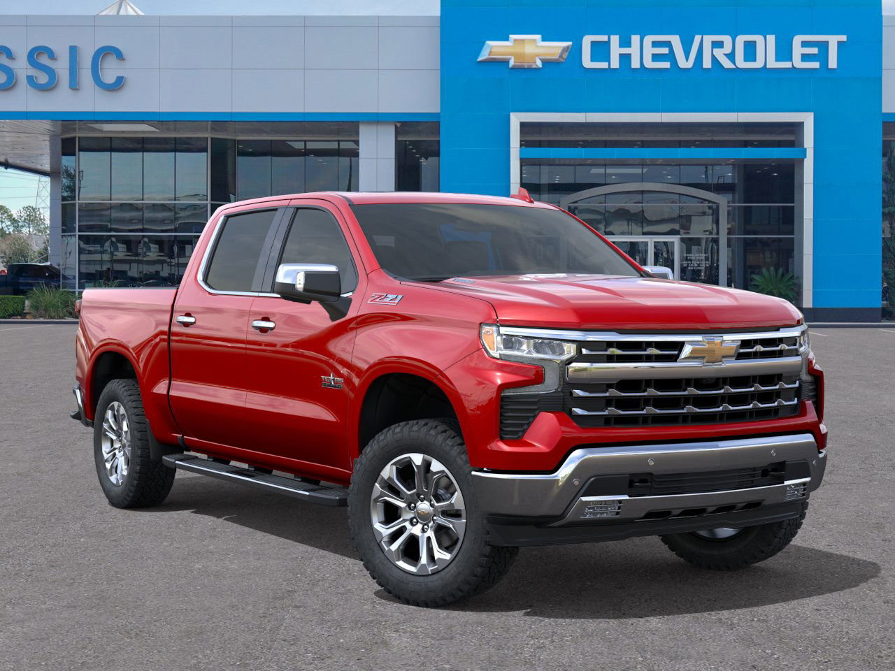 0 rpm, 495 lb-ft @ 2750 rpm) - Transmission: 10-speed automatic with Electronic Transmission Range Selector, tow/haul mode, and steering wheel paddle shifters - Drivetrain: 4WD - GVWR: 7,200 lbs (3,266 kg) - Rear axle ratio: 3.23 - Fuel type: Diesel - City/highway mpg: 22 / 25 - Emissions: 50-state compliant Exterior and cargo - Exterior color: Radiant Red Tintcoat - Wheels: 20 x 9 Sterling Silver painted aluminum - Bed: Multi-Flex tailgate with six functional load/access features - Bed protection: Chevytec spray-on bedliner - Tires: 275/60R20 all-terrain, blackwall - Tow readiness: Tow hitch - Z71 Off-Road package and protection features: off-road suspension, hill descent control, skid plates, heavy-duty air filter, Z71 badge, plus LPO all-weather floor liners - Assist steps: Dealer-installed chrome tubular steps Interior and comfort - Seating: Leather upholstery, bucket front seats, rear bench seat - Power adjustments: Power driver and passenger seats with memory and lumbar support - Climate control: Multi-zone A/C, rear A/C - Heating/ventilation: Heated front seats, heated steering wheel, cooled front seats - Convenience: Keyless start, remote engine start, power windows, power door locks, auto-dimming rearview mirror - Comfort details: Power-adjustable mirrors with memory, privacy glass Technology and connectivity - Infotainment: Premium sound system, MP3 capability, navigation, Bluetooth, auxiliary input, smart device integration, and WiFi hotspot - SiriusXM: Included f