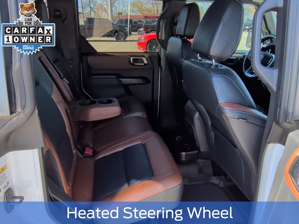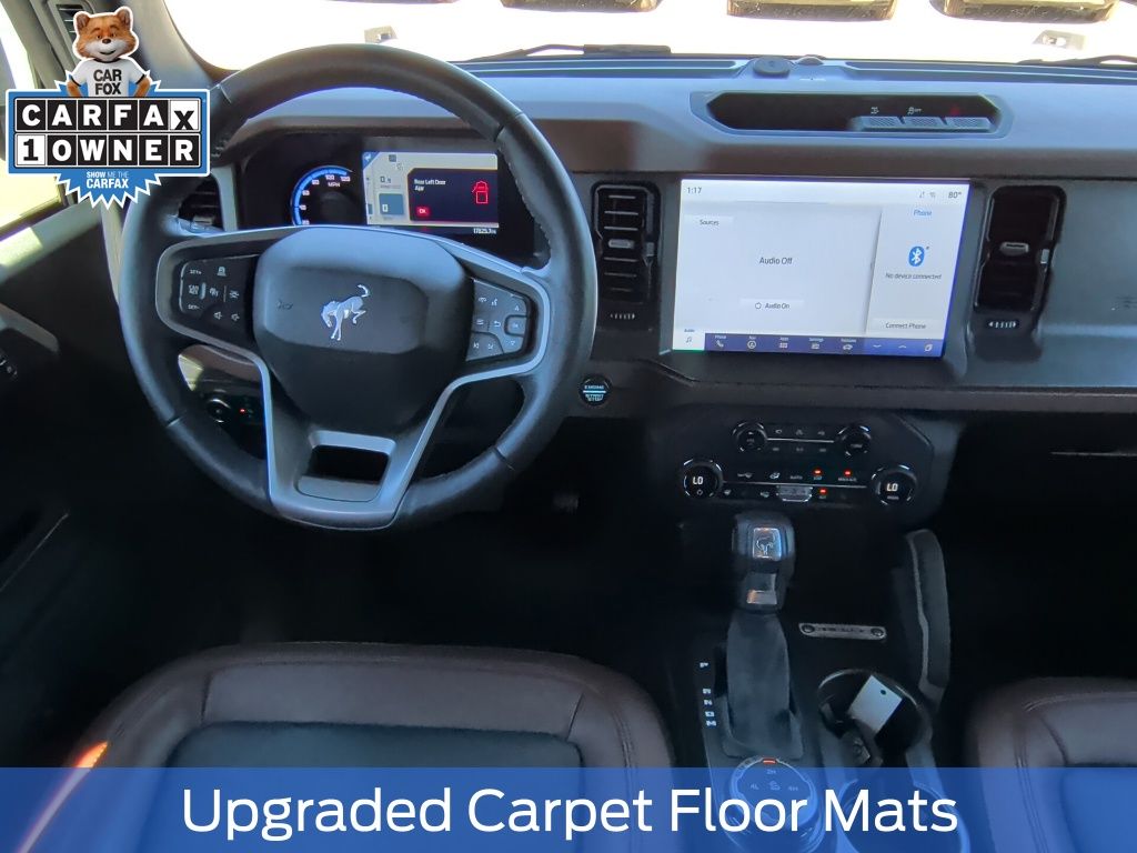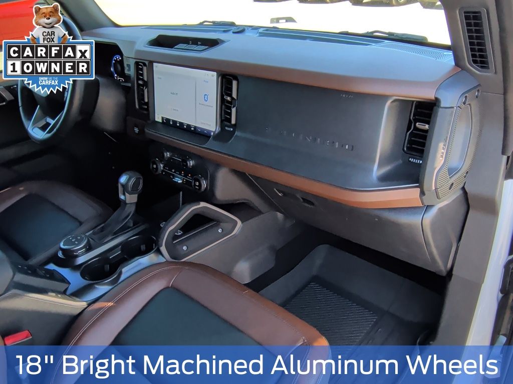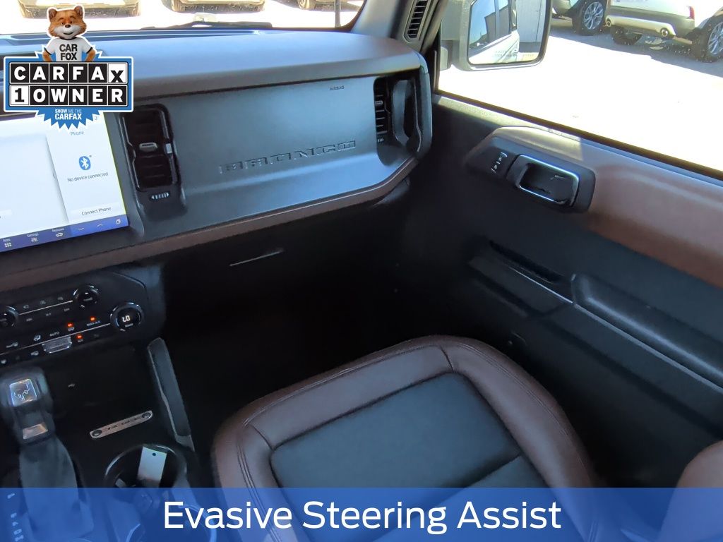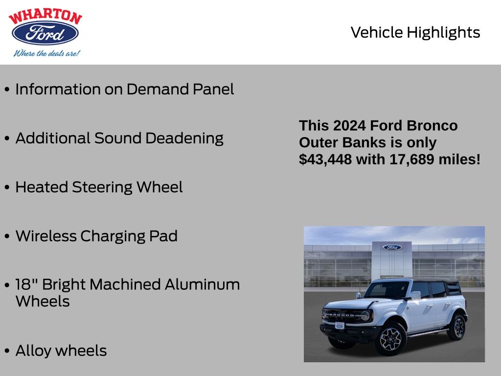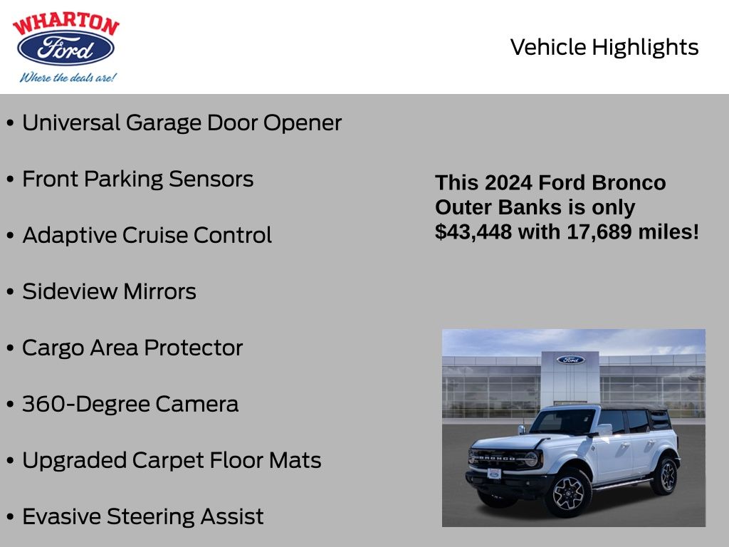 Certified. Oxford White 2024 Ford Bronco Outer Banks 4WD 10-Speed Automatic 2.3L EcoBoost I-4 1 OWNER, 10 Speakers w/Subwoofer, 18" Bright Machined Aluminum Wheels, 360-Degree Camera, Adaptive Cruise Control, Additional Sound Deadening, Alloy wheels, Cargo Area Protector, Equipment Group 314A High/Lux Package, Evasive Steering Assist, Front Parking Sensors, Heated Steering Wheel, Information on Demand Panel, Navigation system: Connected Navigation, Radio: B&O Sound System by Bang & Olufsen, Side