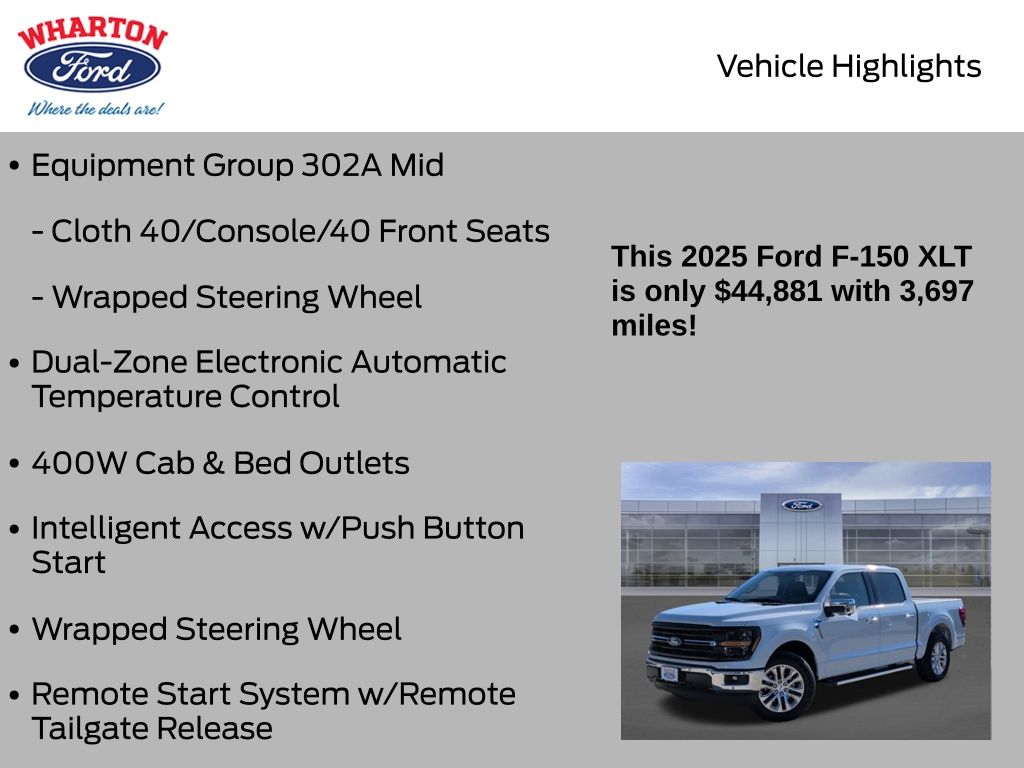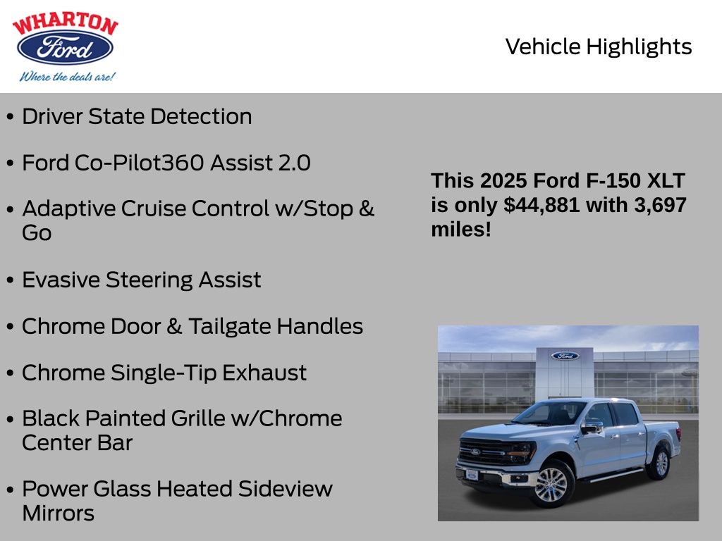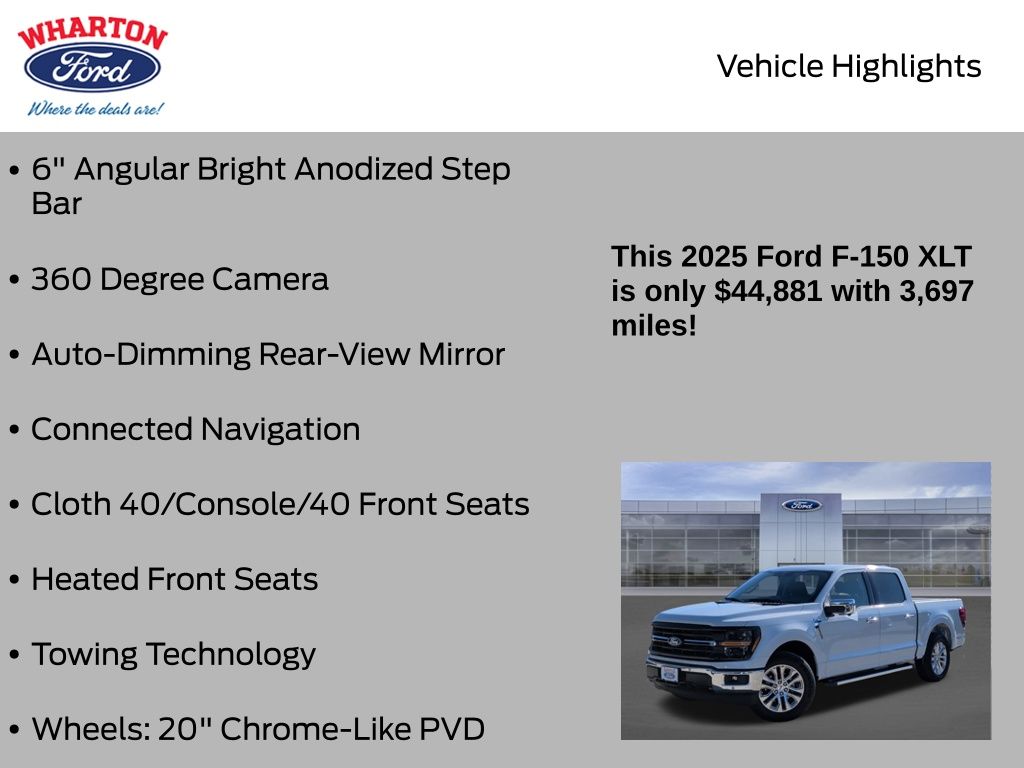 Certified. Space White Metallic 2025 Ford F-150 XLT RWD 10-Speed Automatic 2.7L V6 EcoBoost TRIFOLD BED COVER, 360 Degree Camera, 400W Cab & Bed Outlets, 6" Angular Bright Anodized Step Bar, Adaptive Cruise Control w/Stop & Go, Alloy wheels, Auto-Dimming Rear-View Mirror, Black Painted Grille w/Chrome Center Bar, Chrome Door & Tailgate Handles, Chrome Single-Tip Exhaust, Cloth 40/Console/40 Front Seats, Connected Navigation, Driver State Detection, Dual-Zone Electronic Automatic Temperature Cont
